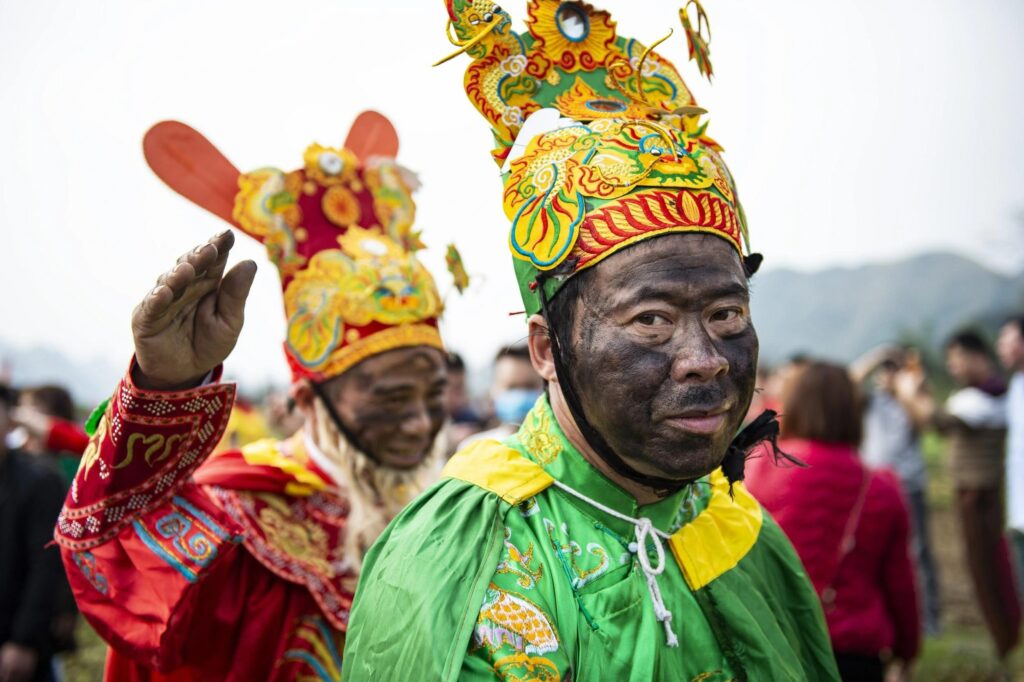 Trong đám rước có 4 người rước long ngai, bài vị không phải bôi đen mặt còn lại tất cả phải bôi mặt đen để mọi người không nhận ra mình.